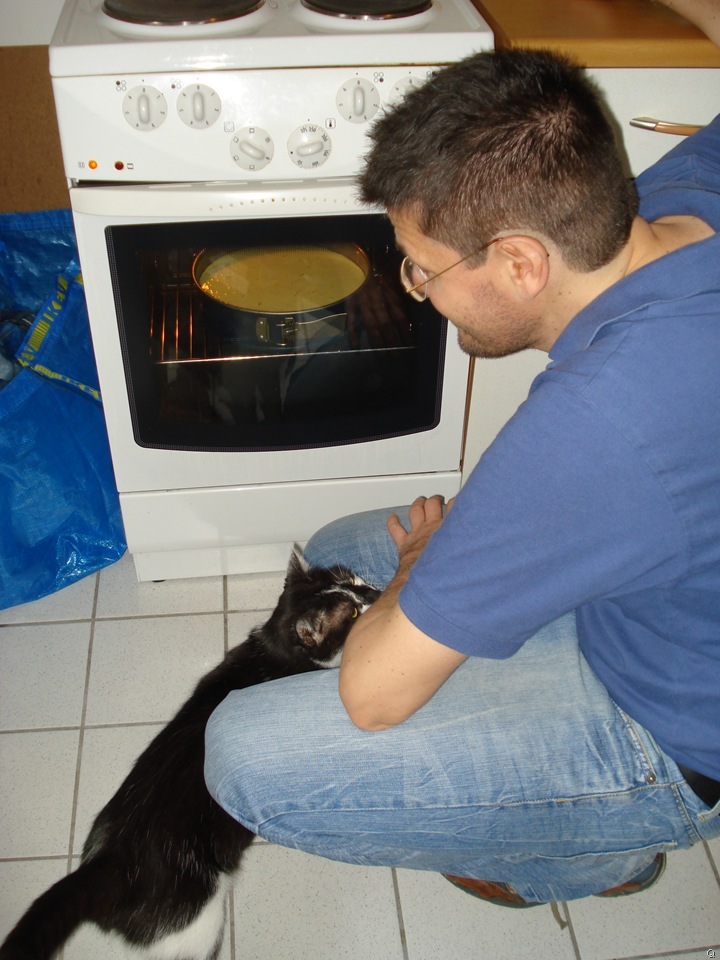 After adding the filling over the crust and adding it in the oven, the waiting period started. Everyone, including the cats, was very eager to see the results of our work.