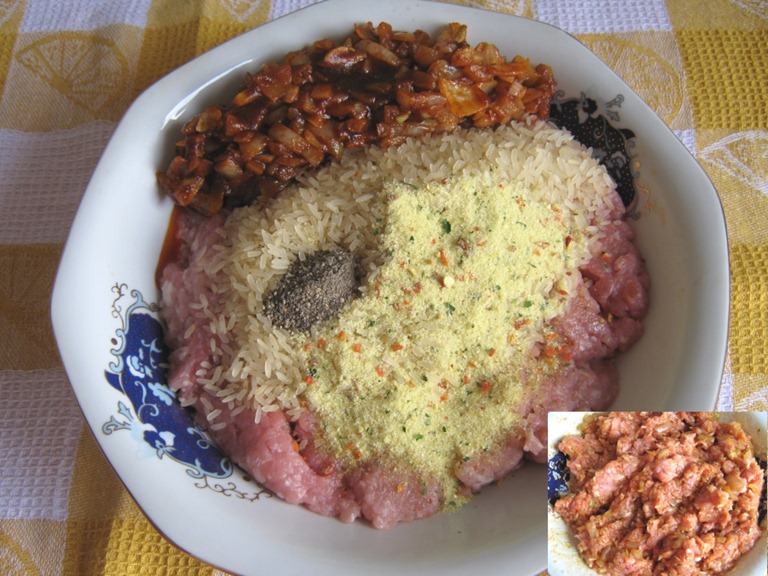 Mix the minced meat with rice, pepper, vegeta and the chopped onion previously fried with paprika.