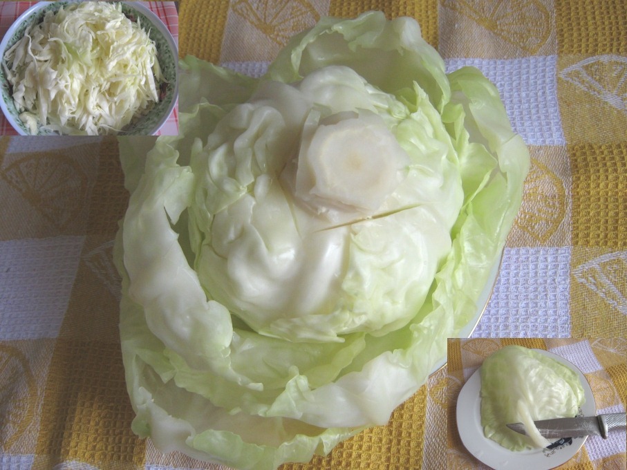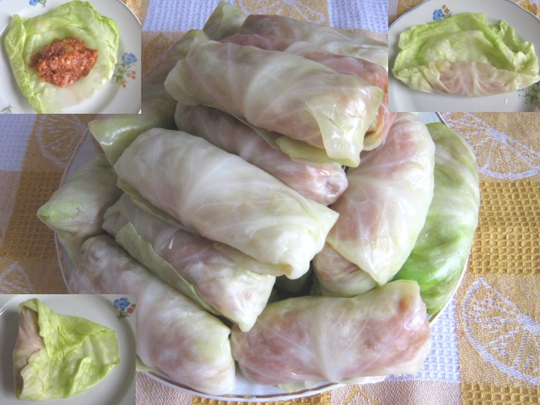 In lack of sour cabbage which should be used, I use fresh cabbage but place it first in hot boiling water to peal the leaves easier.