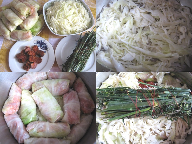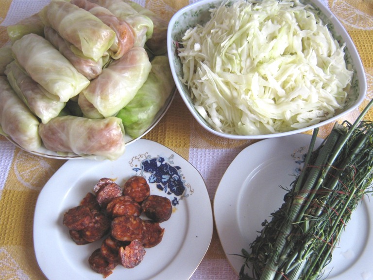 So now you have the cabbage rolls, chopped cabbage, sausage and a bundle of aromatic plants (dill and thyme).