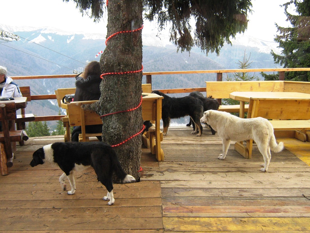 The gondola ride was wonderful, the location is beautiful from above and we enjoyed it. But as we arrived up, we were very disappointed. There’s was mud and melted snow and everything was dirty. It was lunch time already and we agreed prior to coming up that we’ll have it up there. We spotted a self-service restaurant which was closed and a wooden cottage where people were sitting. After going through the mud, we reached it and headed for the terrace which had a lovely view to the valley. We were searching for a table as I noticed that a pack of big dogs without owners was heading our way.