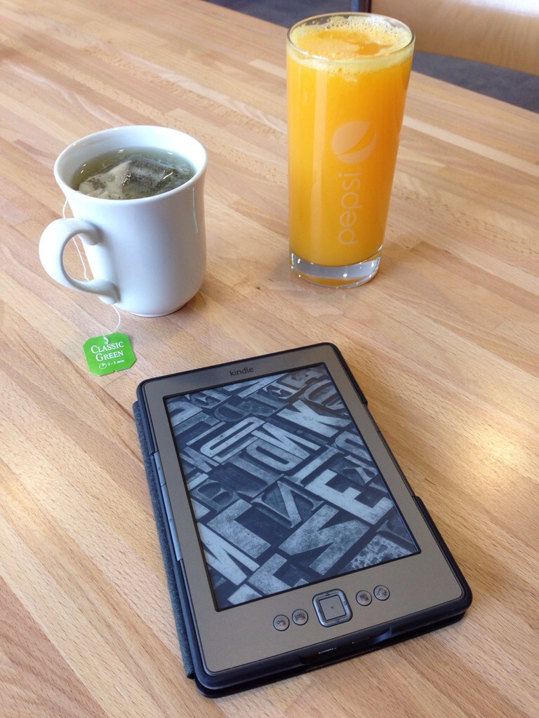 I settled into the cafe with my Kindle, a tea and a freshly pressed orange juice waiting for the sun to come out.