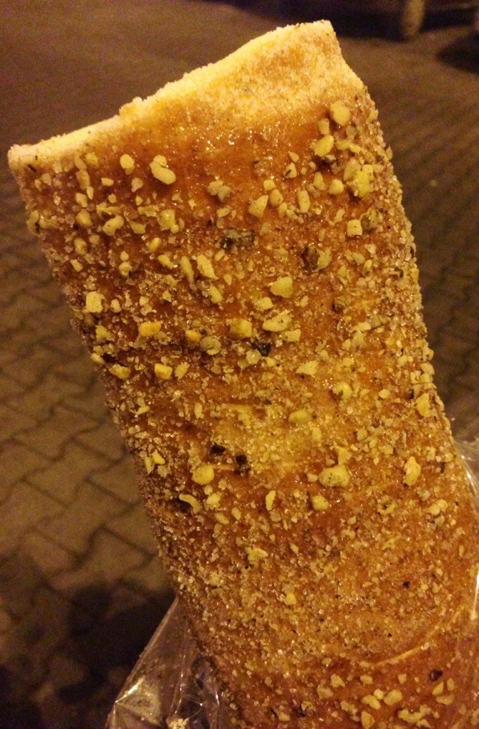 Going grocery shopping while hungry is bad, we ended up buying stuff for the next 3 months (at least we don’t have to go again soon) and as soon as we got out from the super market, we quickly indulged in a Hungarian Kรผrtรถs Kalรกcs covered with walnuts. Yum!