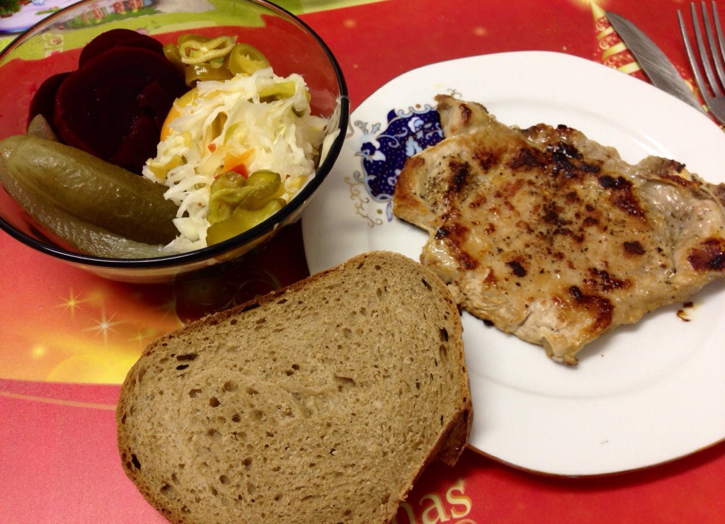 Dinner was a delicious steak prepared by my brother with various sour salads (cabbage, cucumber and red beet) that we bought from the best place in town.