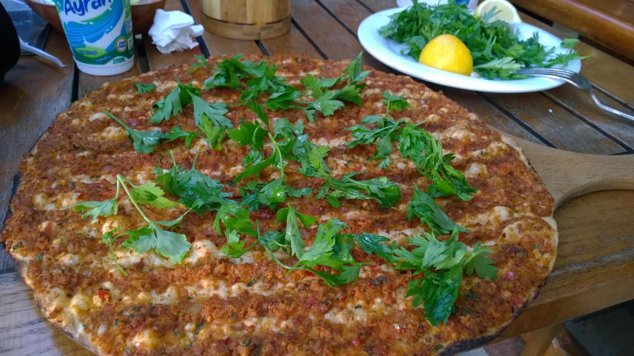 I also drank an Ayran (special turkish drink with yogurt mixed with water and salt) and ate a Lahmacun as a main course, it’s a turkish pizza with a thin crust topped with minced meat and sauce. Unlike anywhere else where I’ve seen this (where this pizza was pre-prepared and simply heated up), this restaurant prepared it and baked it fresh in their stone oven and served it with a big plate of parsley and lemon wedges. The friendly waiter explained that the parsley is for filling the pizza and then I should roll it up. You can pick how spicy you want it, I chose little spicy since I don’t know the usual spicy levels here but I think I can handle more next time.