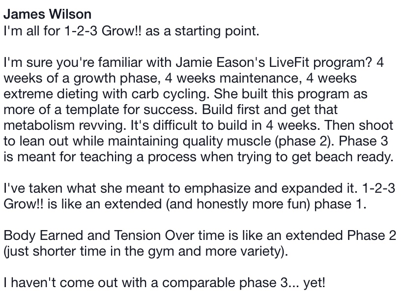 I’ve purchased James Wilson’s Body Earned 12-week program some time ago and did the first 6 weeks and loved it. Tension Over Time picks up where Body Earned left off with weeks 13-24. These are programs designed for fat loss and James released a program for muscle growth recently as well, 1-2-3 Grow!! which I also bought a few weeks ago.