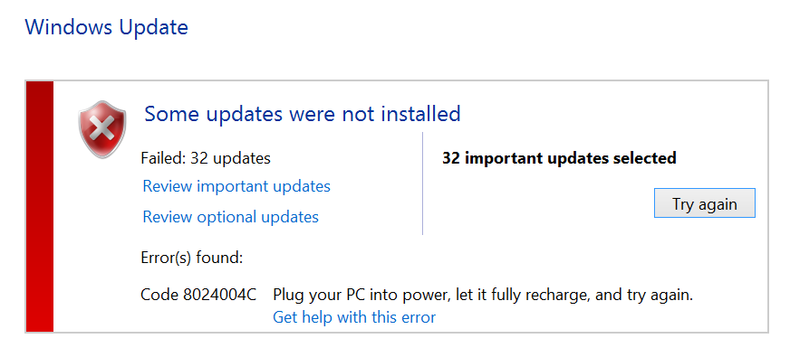 I had 31 updates for Windows 8.1 plus the Windows 10 installation selected in the Windows Update list and the update fails with error code 8024004C. “Get help with this error” was useless, there is no information about this error in the Microsoft help unfortunately.