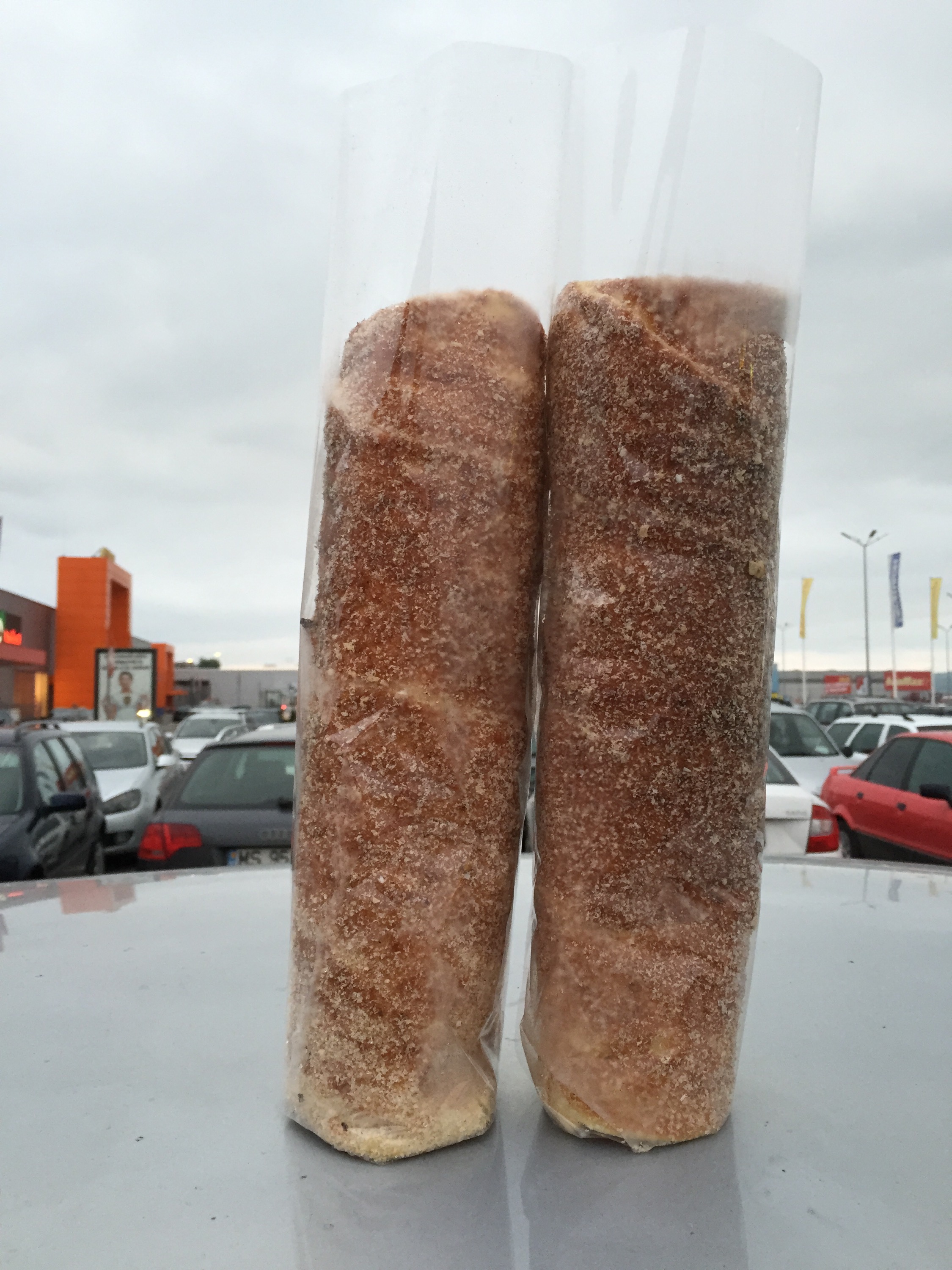 We hurried back to my hometown to catch our usual favorite place where they sell chimney cake before it closed. We bought two! 🙂