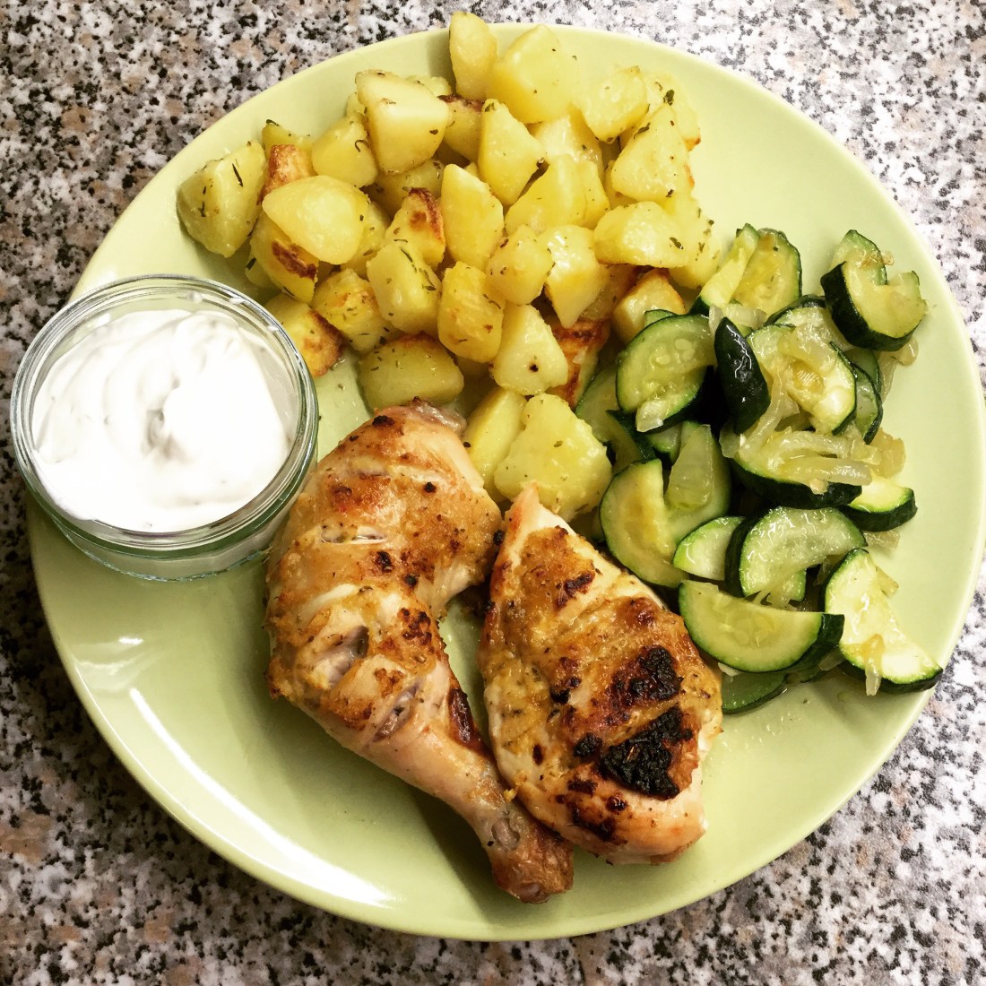 We spent the rest of the day relaxing on the couch and watchingย Supernatural. Dinner was tuscan lemon chicken with potatoes, zucchini and yogurt-garlic dip. This was a huge plate of food and I managed to eat it all. This girl needs fuel for her workouts. ๐