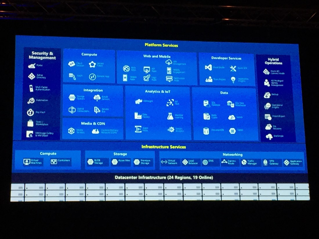 Azure is huge. It can be overwhelming. To understand what to use, the appropriate services. Azure has 3 core services: platform service, infrastructure service and datacenter infrastructure. You control everything, except maintaining the physical hardware. Some services are bundled together: IoT Suite, AppService. A lot of choices to make.