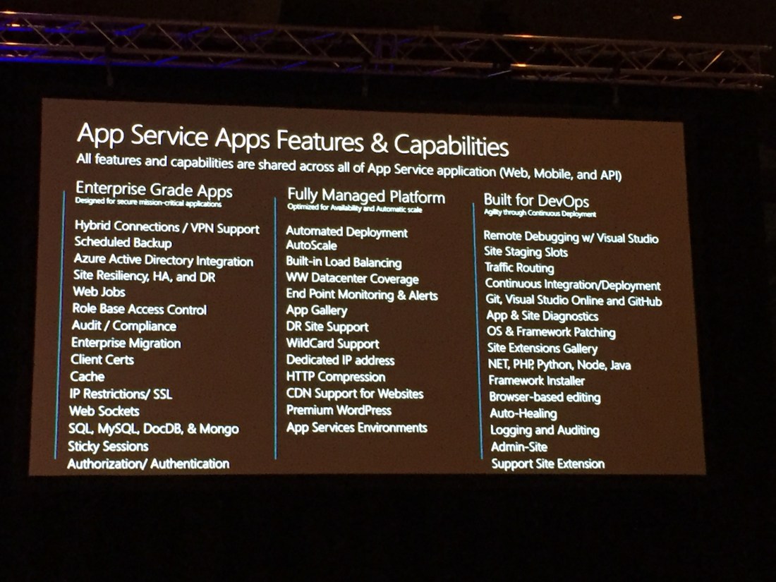 It has web, mobile, logic and API apps. Bundled together with one integrated offering. One low price. Delivers ease of use, having power and control, making sure that Microsoft gives you maximum productivity. 2 new features every month, use User Voice to request features and the most voted ones get built.