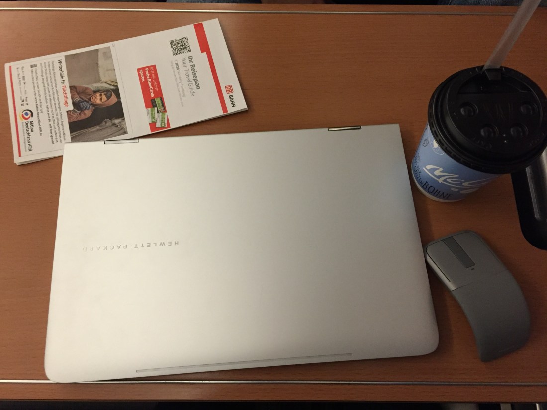 So awake at 4 in the morning, we take the train from 5, pick up a cappuccino from McCafe and catch the connecting train to Frankfurt at 5:30. We get some great seats with a table, I pack out my gadgets, my most loved HP Spectre that I got at Build last year :), my Kindle and get comfortable for the 2,5 hours train ride.