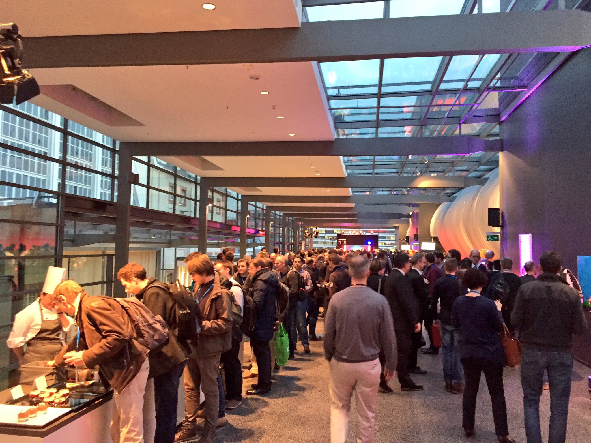 A quick coffee break after the keynote and the next sessions are on. Time passes fast. Next up is lunch break. We go downstrairs and realise that there are huge lines and all the tables are occupied. I shortly think about skipping lunch but eventually decide to try my luck at one of the lines. It goes faster than I expect and I check out the healthy choices: appetizers, vegetarian curry with rice or calf with rösti and vegetables. I am happy and some conferences could learn from this. We are sitting all day in sessions and burrito and cake is not a healthy lunch choice.