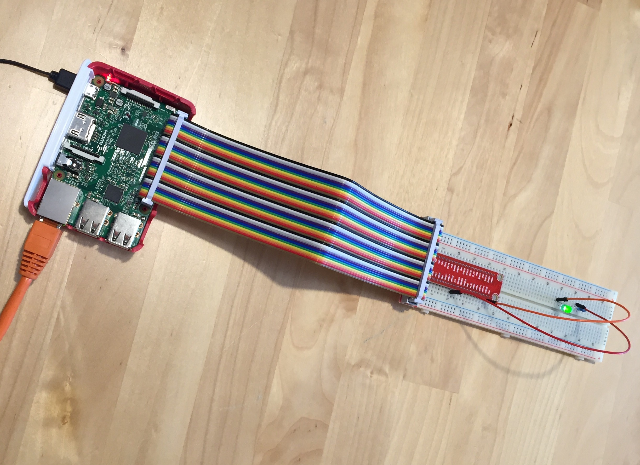 We use the 40-pin GPIO extension board and GPIO cable to connect the breadboard to the Raspberry Pi 3. We connect the LED to the device as described in the Blinky Sample. At this point we simply connect the wire from the pin to the ground to check if it all works.