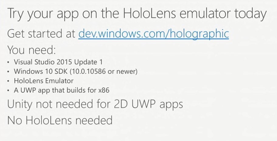 No HoloLens needed. Use the HoloLens emulator to test your app. You need Visual Studio, Windows 10 SDK and HoloLens emulator. Unity not needed for 2D UWP apps. The emulator lets you interact with a virtual machine running the same OS but no head and hand tracking, no gestures. Uses mouse and keyboard input to simulate this input. No support for printing and sharing.