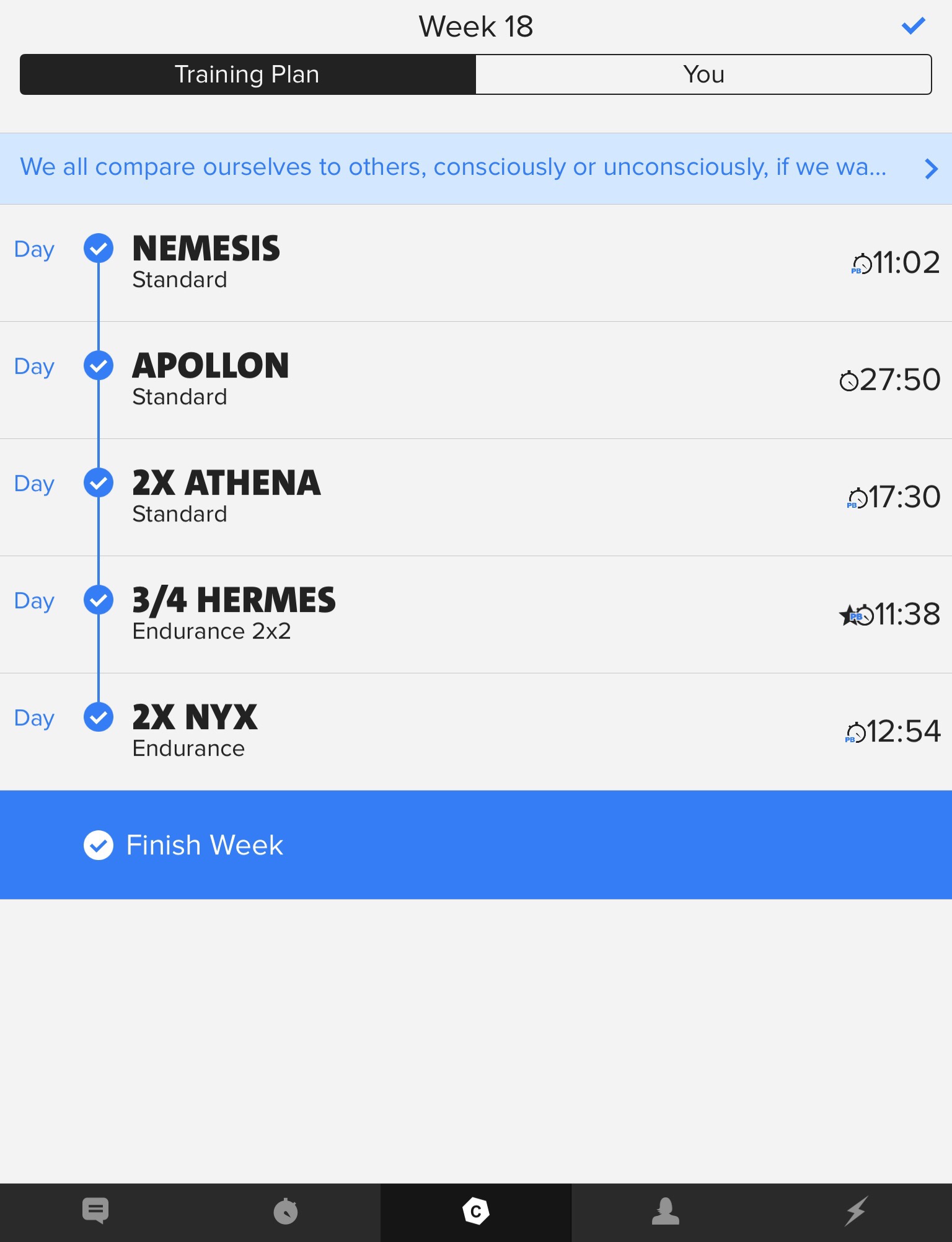 5x6x HIT sessions with Freeletics Bodyweight.1x weight training with Freeletics Gym.- 3x workouts with Kayla Itsines Summer Sweat Series Week 1.