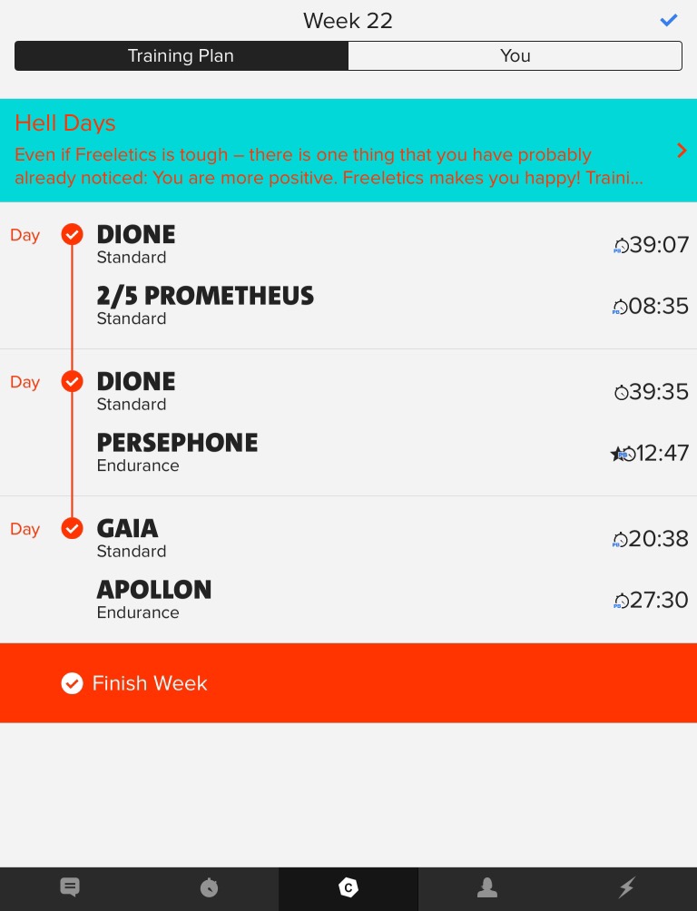 - Hell Days with Freeletics Bodyweight: 6x HIT workouts, 3 training days with 2 workouts.
