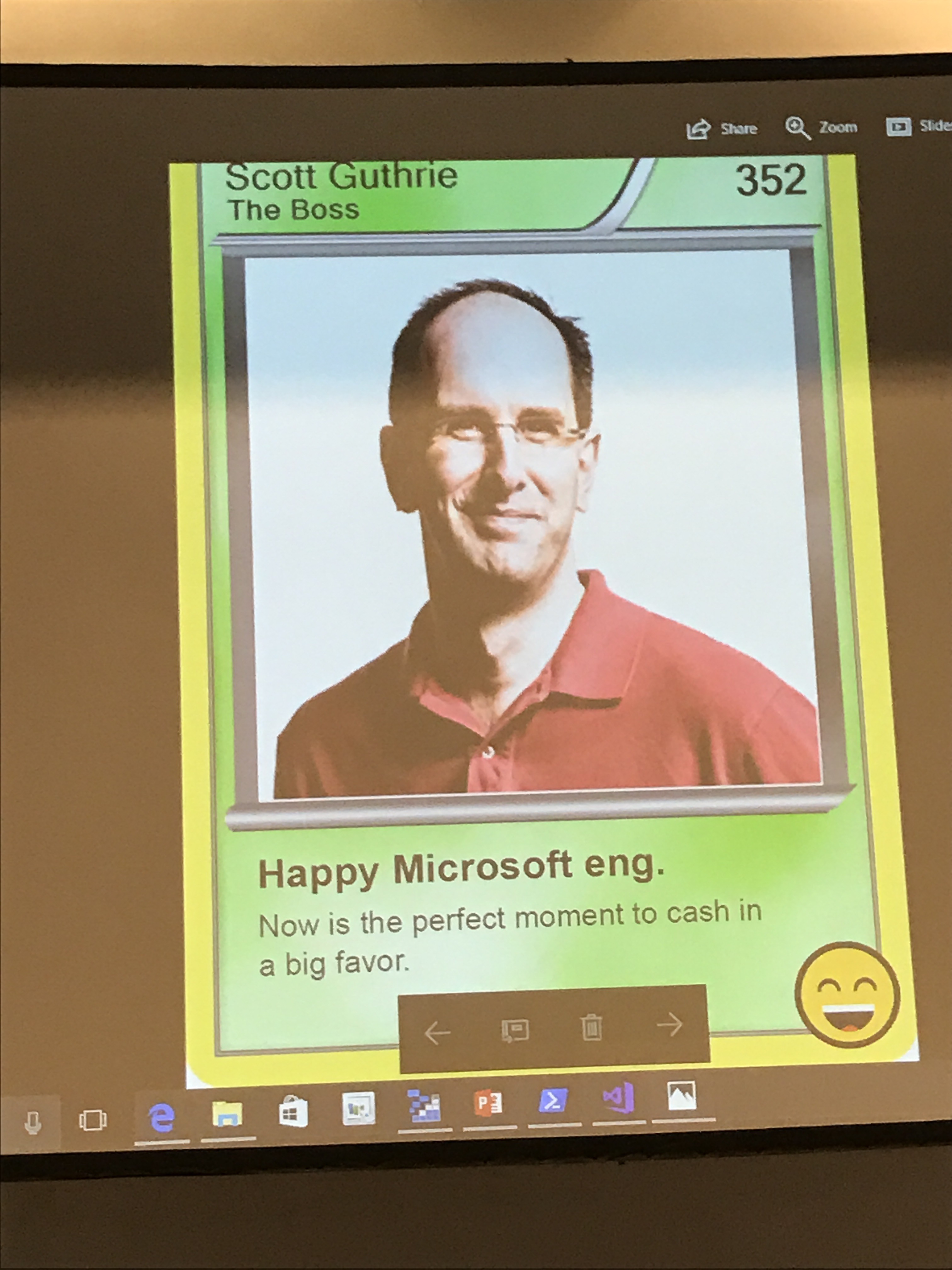 Containers are like mini VM but strip out all the nonsense. It will run the same way no matter where you host it. You can use .Net and Java. .Net even on Linux with .Net Core. We need to be able to do CI. Full set of tools in VS to help managing containers. To dockerize a project, all we do is Add Docker Support on the project in VS, this creates a Dockerfile in the project. Instead of IIS Express, run with Docker, which packages it up and deploys to Docker. “docker ps” in command line to see list of containers. We can set breakpoints and debug, even if it’s running on a container. Changing a file saves it and pushes it to the Docker container.