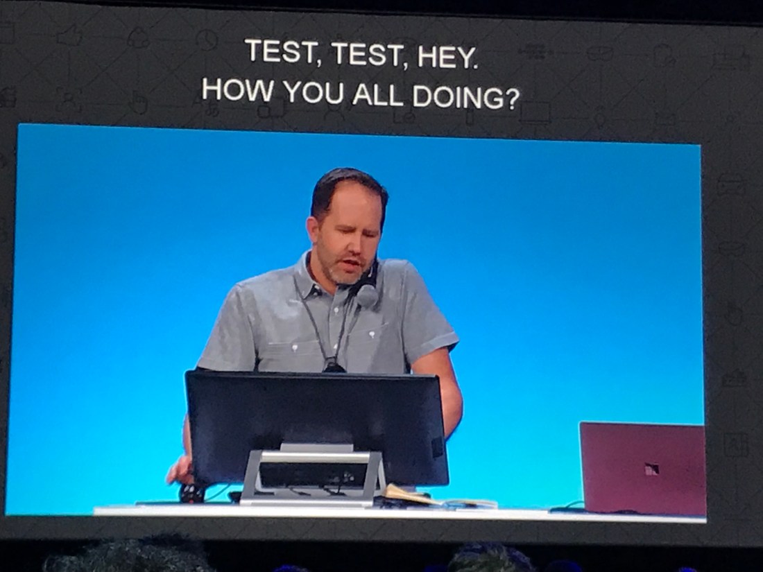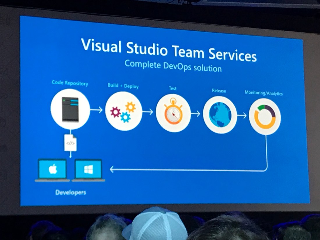 DevOps demo with VSTS by Donovan Brown, DevOps advocate: Kanban board, 77000 tests running 600 times a day. Release gates. Automated safe deployment. New feature in the Azure portal: new feature DevOps projects.