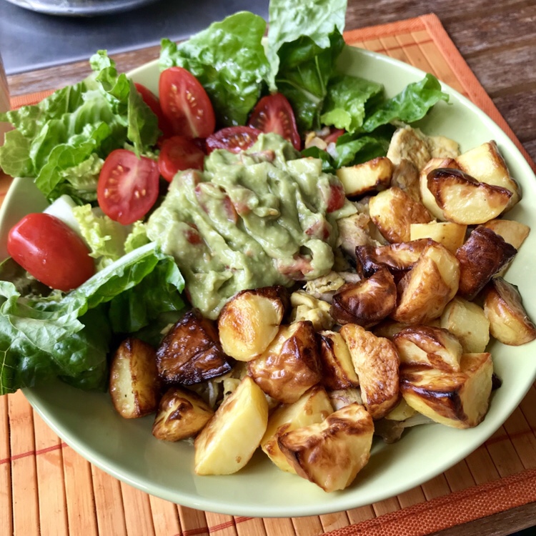 Arrange the fresh salad on the plate, add the scrambled eggs, top with roasted potatoes and guacamole. Enjoy! ๐