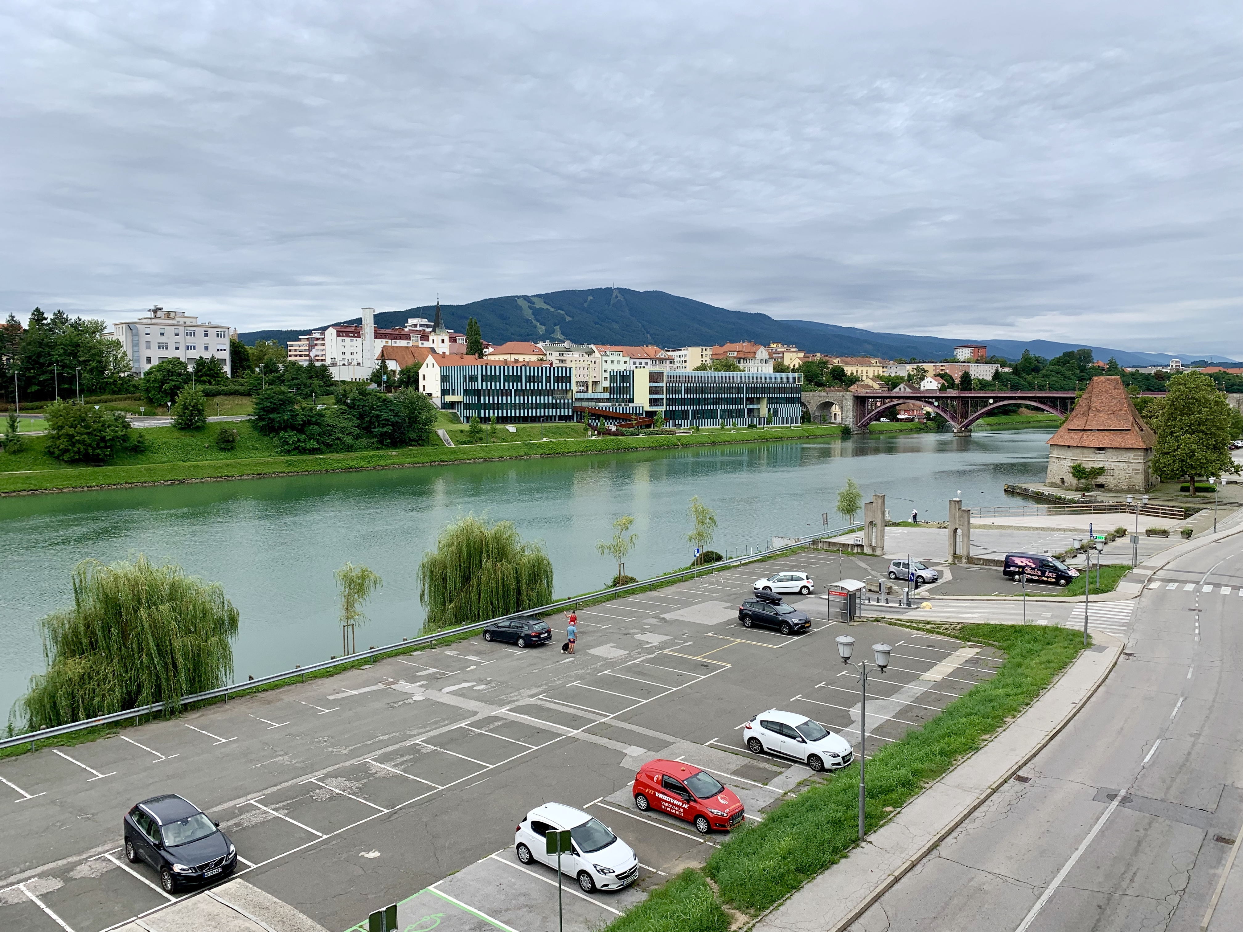 We left Zadar around noon and the drive to Maribor should have taken 4 hours but we were stuck in a traffic jam in front of the border for 3 hours so it took us 8 hours to get to Maribor. We arrived at 20 o’clock in the evening to the hotel. We spent the night at Hotel City Maribor, we got a huge room directly overlooking the river. The restaurant on the 5th floor has a gorgeous terrace also overlooking the river.