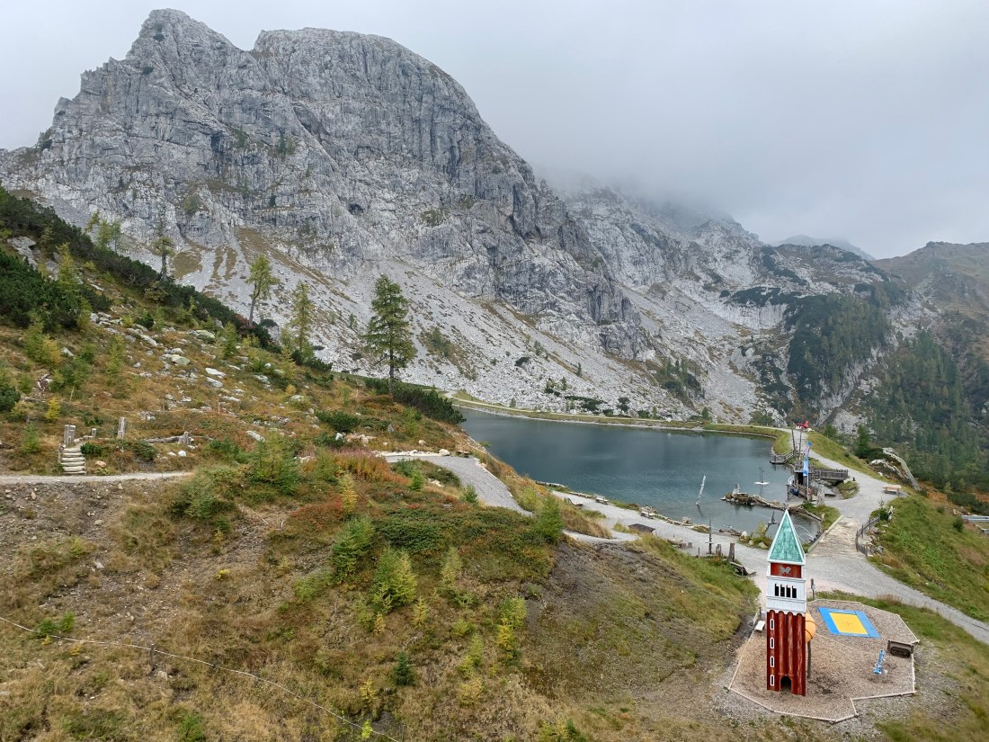 We were very lucky to arrive one day before they close the Millenium Express lift and they will open it for the winter skiing season beginning of December. So we took advantage on the next day and took the lift all the way up to 2000 meters. It was warm and sunny in the valley but it got very cold, cloudy and windy on the top of the mountain. We decided to hike on the Aqua Trail, it took us along beautiful water and ponds and lakes surrounded by huge mountains. The trail is for families and kids to learn about the water in the mountains but we, two adults, loved it as well.